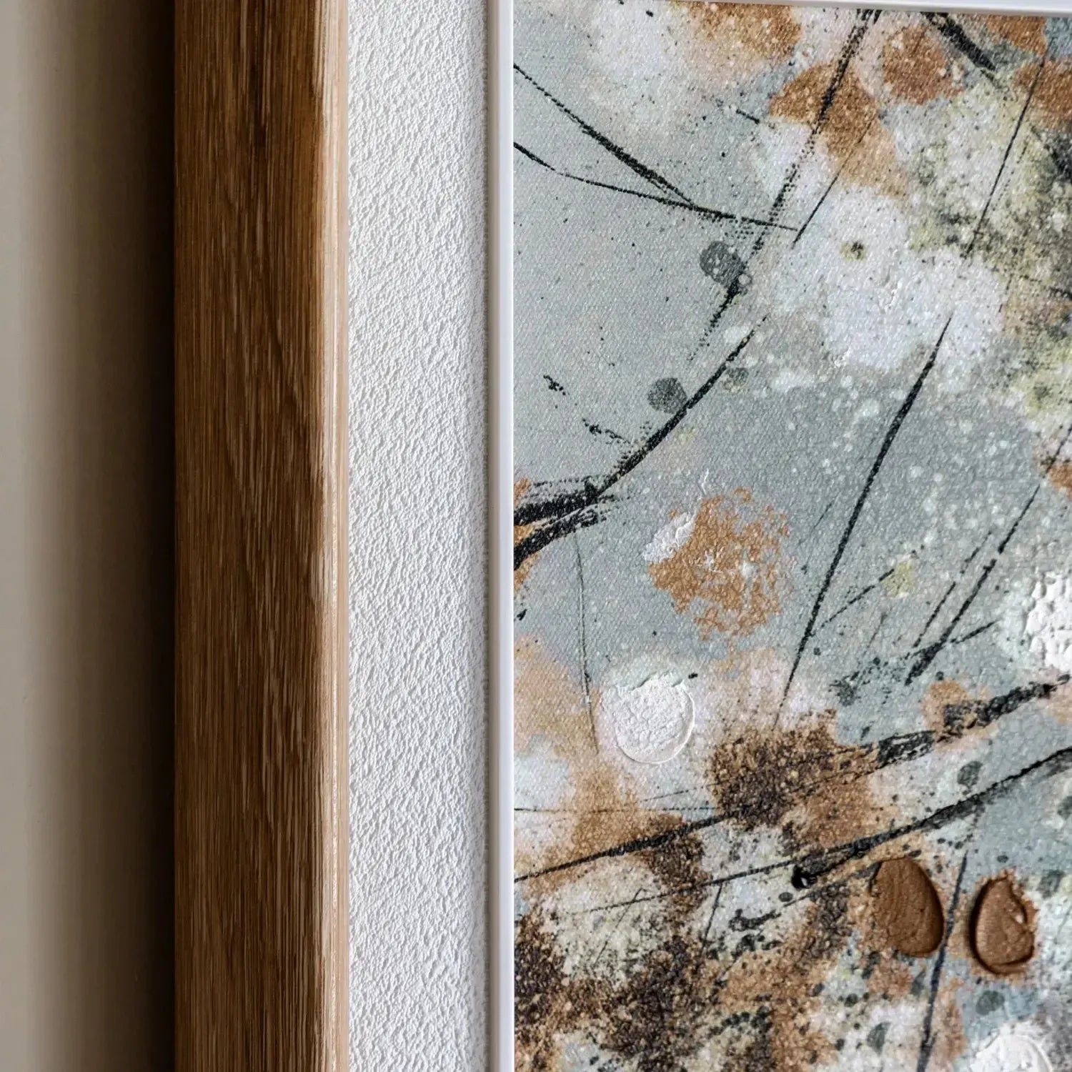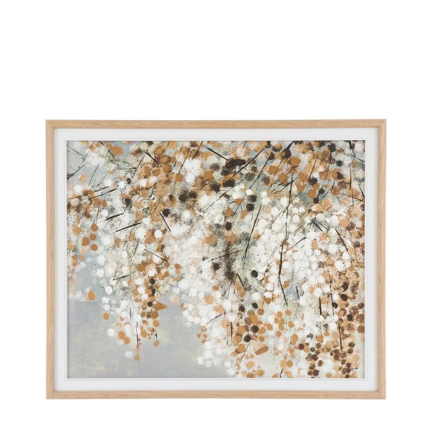 In this piece, the artist captures the gentle rhythm of nature in a textured composition of cascading branches and foliage. Layers of gold, white, and soft neutral tones are applied with expressive hand painted brushwork, generating depth and luminosity that evoke light filtering through autumn leaves, creating a tactile surface with a natural warmth.