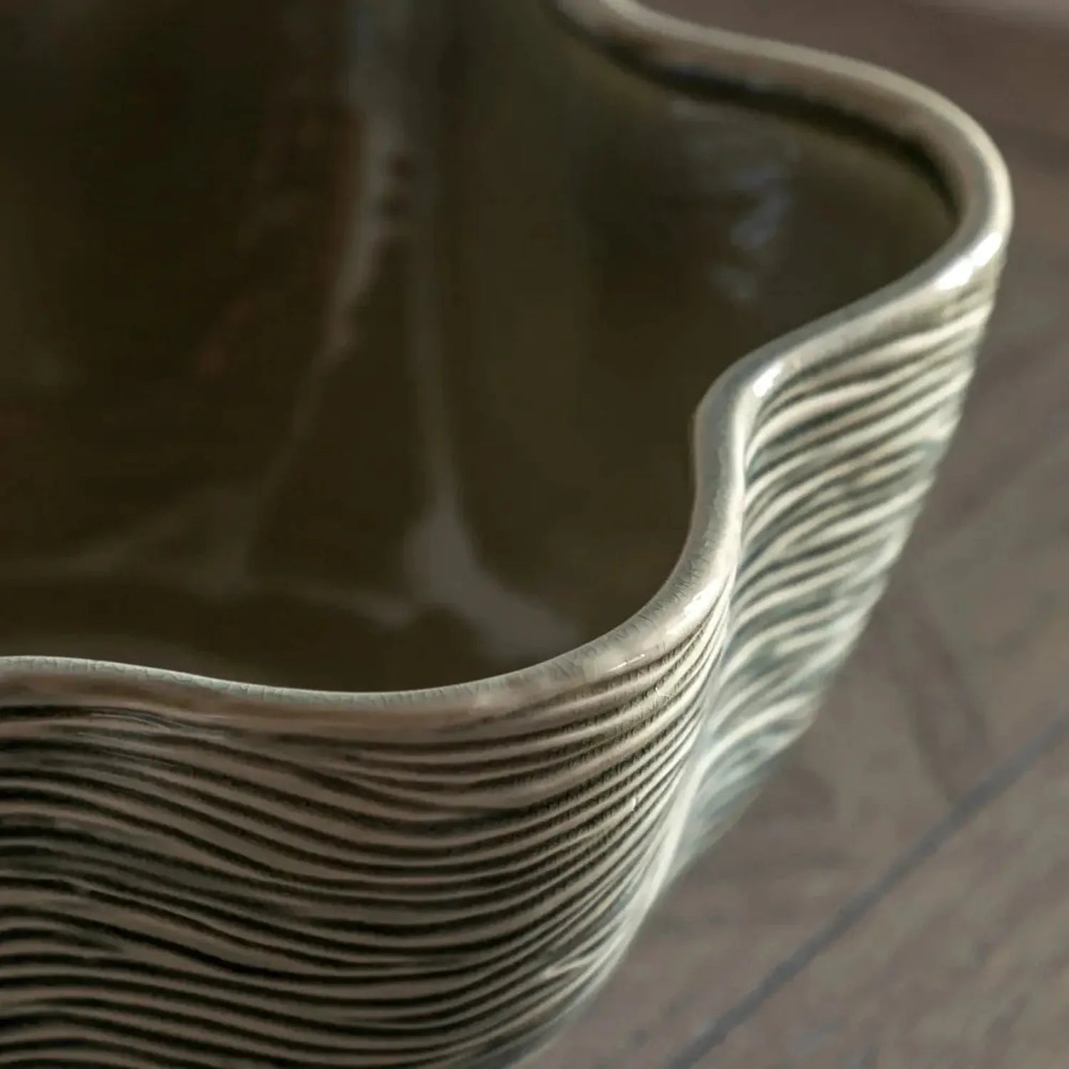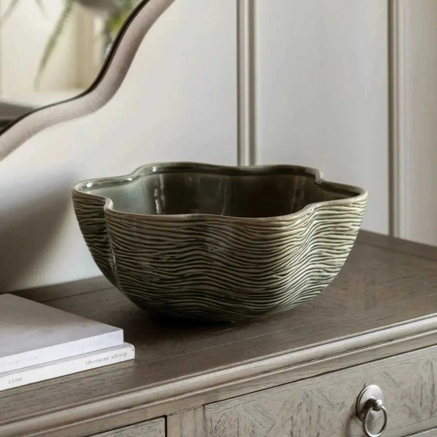 With its flowing, organic silhouette, this bowl brings a sense of natural elegance to any space. Subtle ridge detailing wraps around the form, adding texture and movement, while the soft green glaze enhances its handcrafted, tactile appeal.