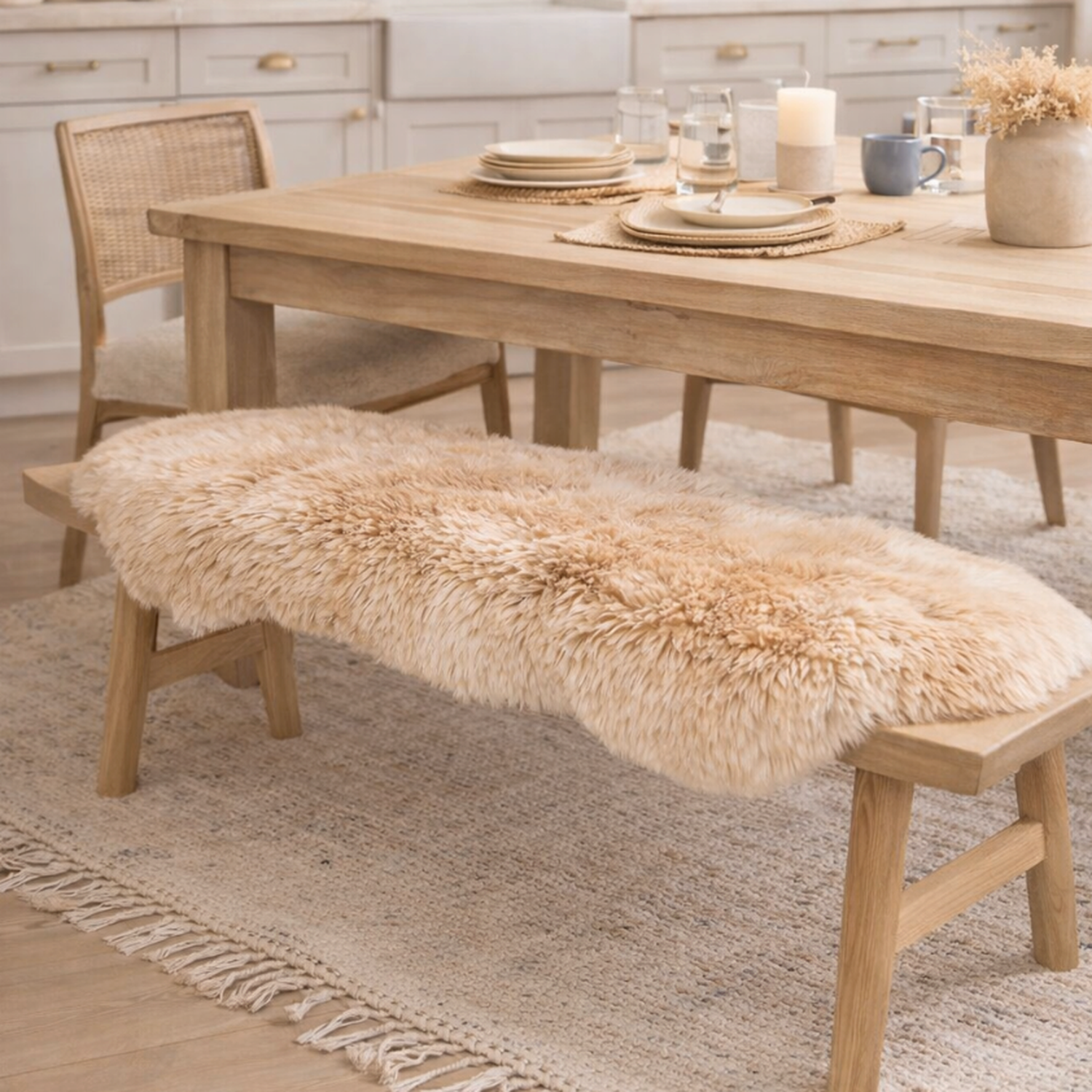 Late afternoon light spills across the floor and everything feels a little slower. Our double sheepskin rug is made from two plush sheepskins, carefully stitched together to create a generous layer of softness underfoot.
