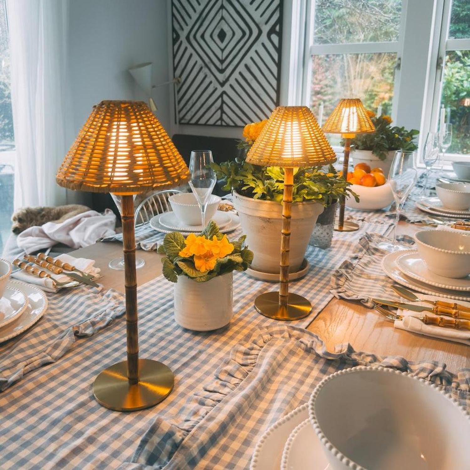 Create a tablescape that radiates calm, coastal charm with our Bamboo Rechargeable Lamp, paired with a handwoven rattan shade. Crafted from natural bamboo with an earthy putty-toned finish, this cordless lamp adds a warm, ambient glow to any setting—no outlet required. Designed to bring a sense of quiet luxury to your table, mantle, or nook.