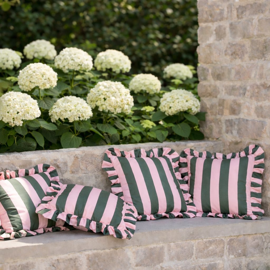 Our Palm Royale cushion pairs classic cabana stripes with a playful ruffled edge, bringing a relaxed, resort-style charm to outdoor seating. Designed for garden chairs, sun-drenched terraces, and slow summer afternoons, the water-resistant fabric helps it stay looking fresh through the changing seasons.