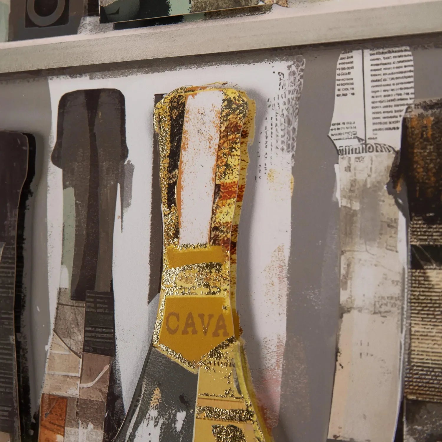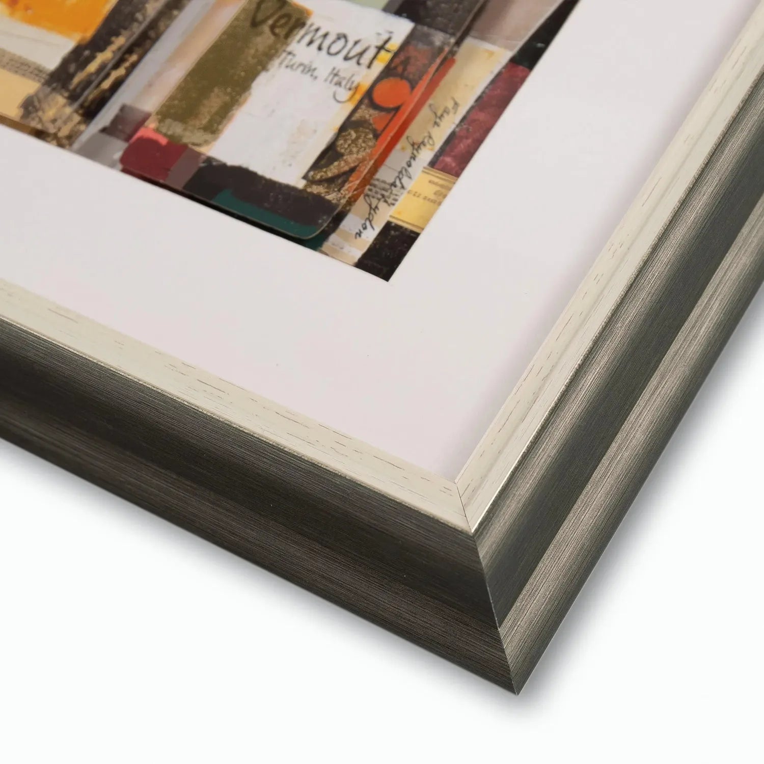 With varying texture and depth, the composition holds layers to create curiosity. The use of metallic foil, positioned with precision, adds a touch of sophistication, intriguing the viewer and drawing their eye to the intricate designs of the bottles. The styling is complete with a white mount and a slimline wood effect frame with champagne silver edging.