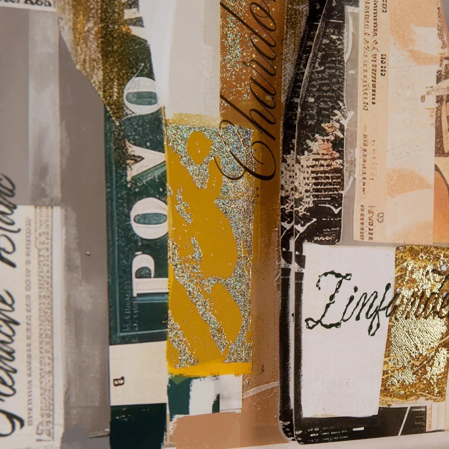 A celebration of global wine culture, Faye Reynolds-Lydon has designed a vibrant feature piece showcasing winemaking's diversity through a rich display of wine bottles. The artwork captures each bottle's personality through a collage effect, highlighting the visual beauty of the wine.