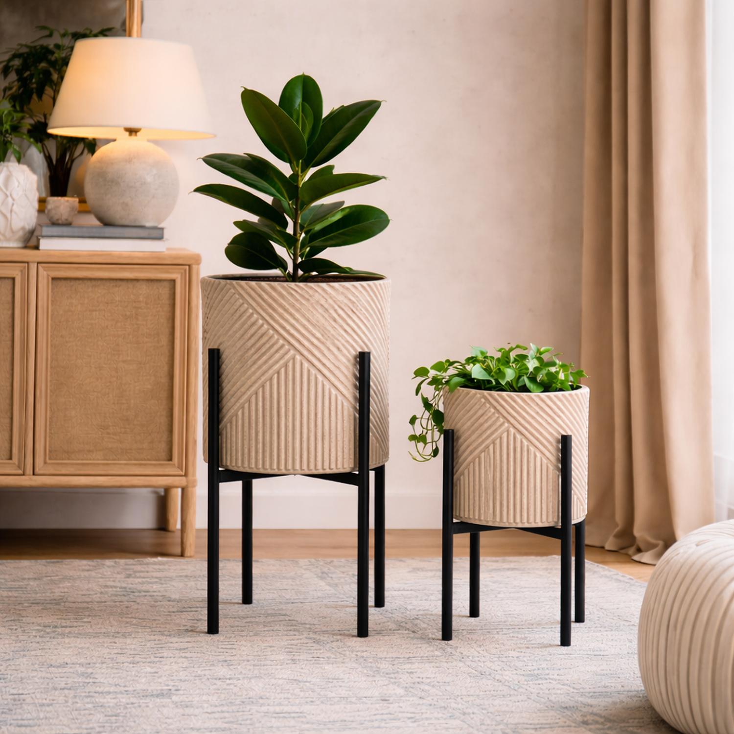 Set on four slim black metal legs, the planters are gently raised to create height and a sense of lightness. The contrast between the warm ceramic tones and the sleek metal frame gives the pair a modern, considered look—perfect for adding structure and style to contemporary interiors.