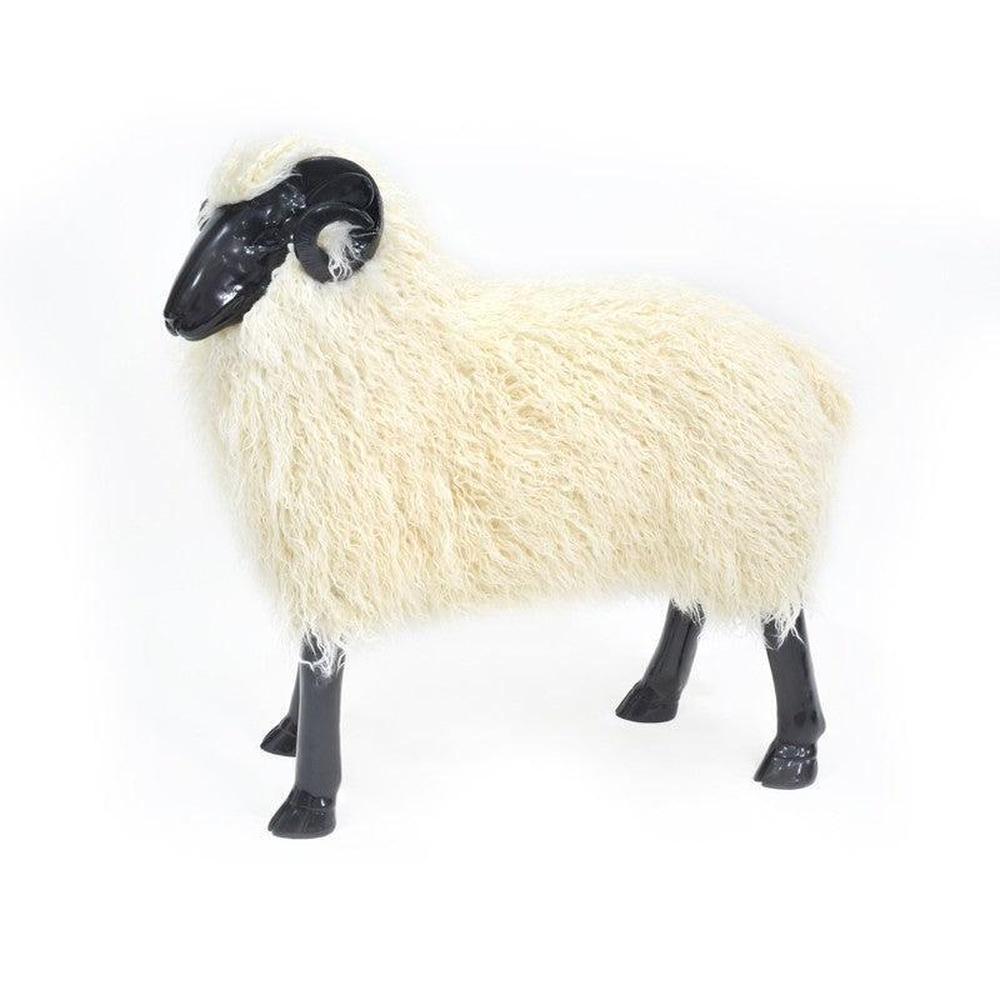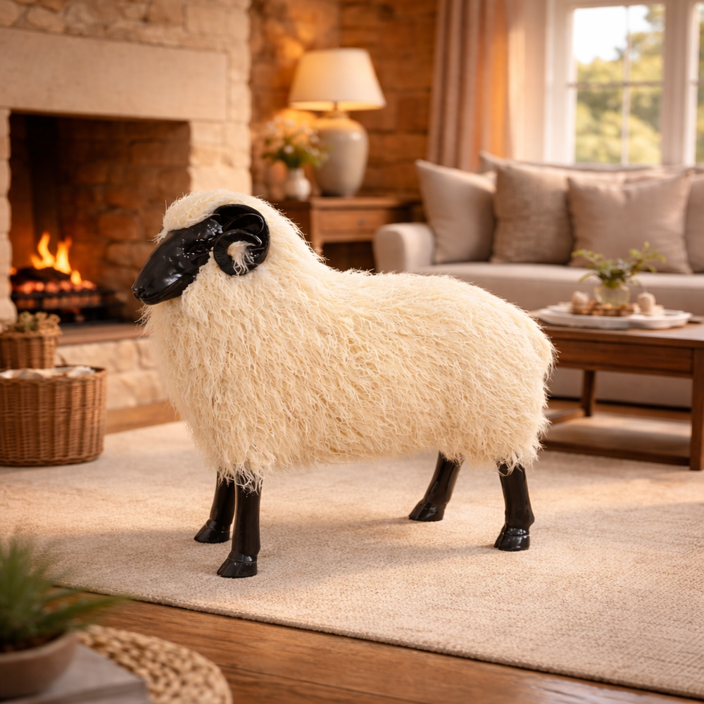 Rooted in the quiet romance of the English countryside, this sculptural sheep is a celebration of pastoral charm elevated to an artful statement. Its softly textured fleece contrasts beautifully with the inky, polished horns and legs, creating a striking balance between warmth and refinement. Designed with lifelike proportions and an unmistakable presence, it feels less like décor and more like a collected object—something discovered in a storied Cotswolds home and carried forward into a modern interior with intention.