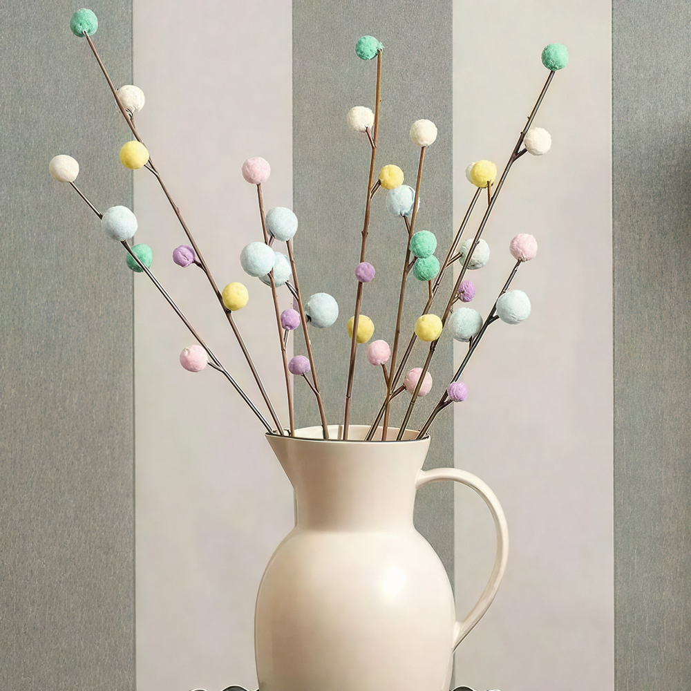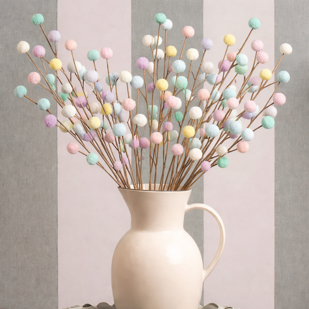 This 65cm artificial pastel pom pom stem introduces a sense of play and lightness into interior and celebratory spaces. Its soft colours and rounded form echo cultural associations with joy, festivity, and creative expression, offering a decorative element that breaks from natural realism in favour of visual delight.