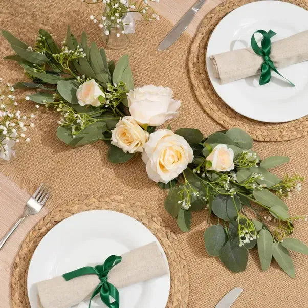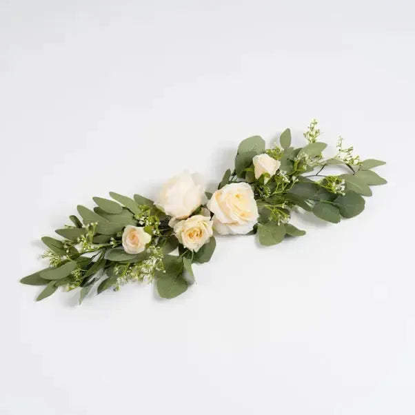 This artificial eucalyptus and rose arrangement blends rustic heritage with refined elegance, acting as a material expression of how people construct meaning within their homes. Soft cream roses and lifelike eucalyptus leaves rest on a cowhorn-shaped base, a form that subtly evokes pastoral traditions and our impulse to recreate natural beauty in curated, interior spaces.