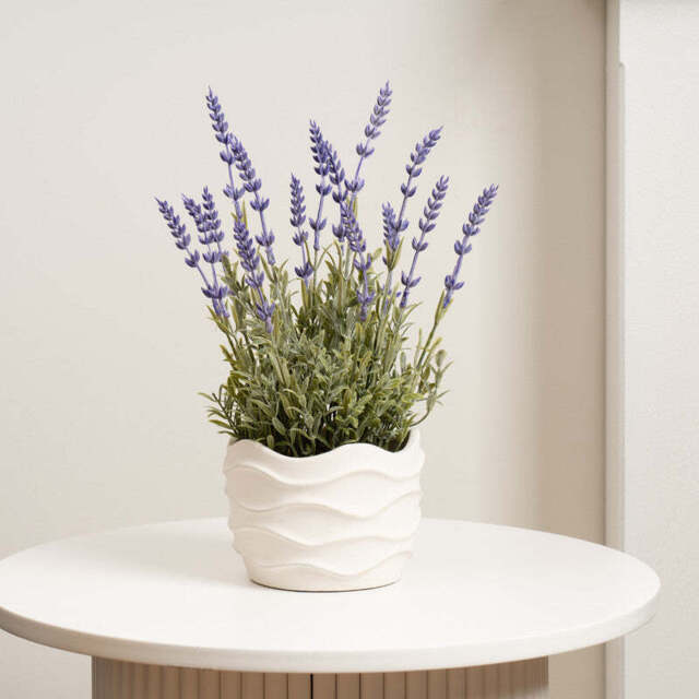 This 33cm artificial lavender plant offers a refined interpretation of calm within the domestic environment. Its soft purple blooms draw on long-standing cultural associations with rest, cleanliness, and wellbeing, while the wavy cement pot introduces a modern material contrast that anchors the piece within contemporary interior design.