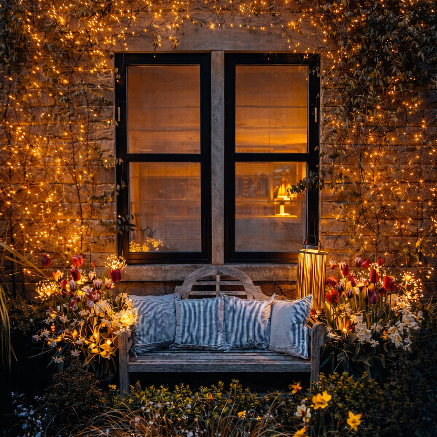 As twilight settles and the garden softens into shadow, these botanical branch lights begin to glow, casting a warm white shimmer through leaves and along patio railings. Flexible and sculptural, each branch can be gently shaped to suit your space, whether wrapped around a trellis or woven through a favorite planter.