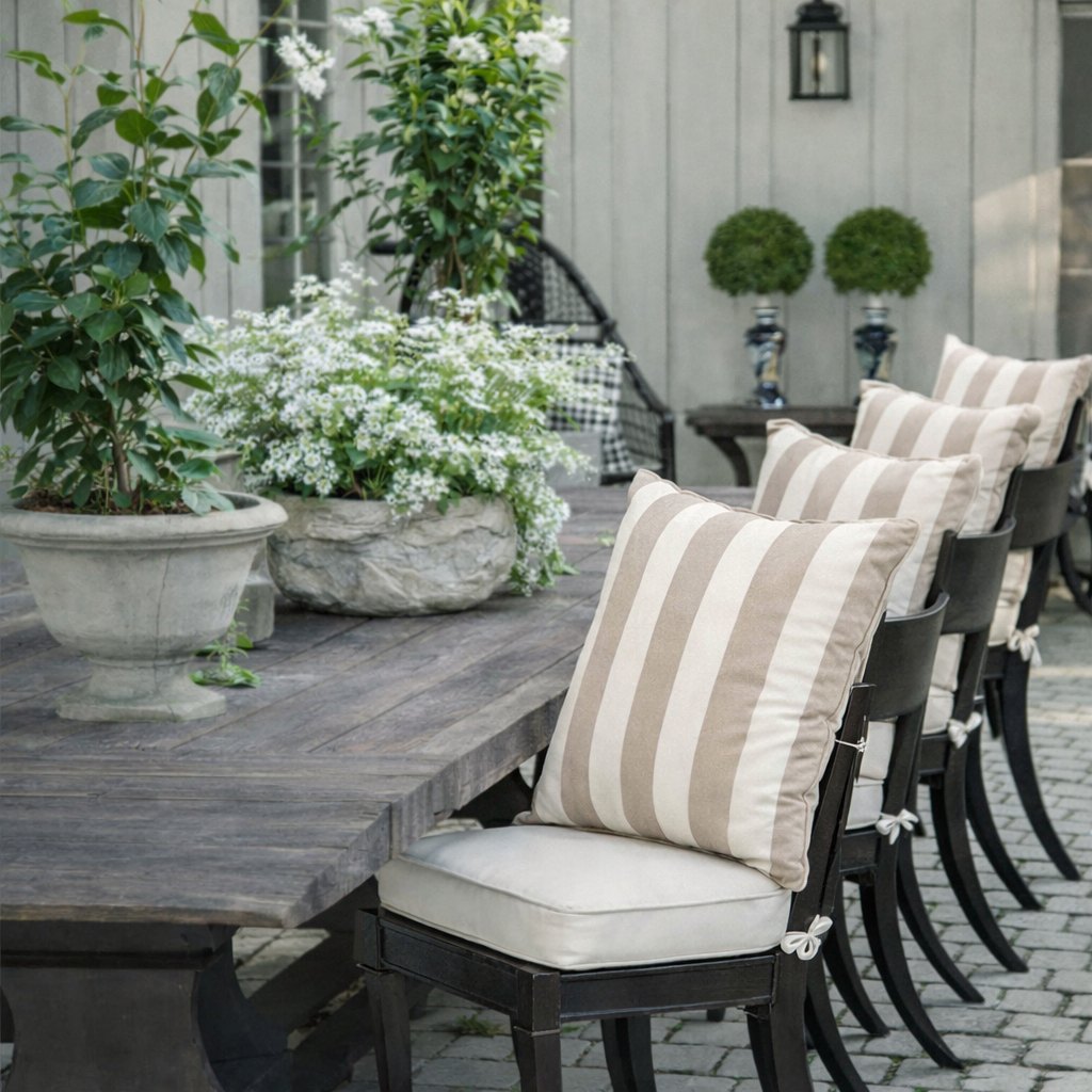 Our cushion use classic stripes with a playful ruffled edge, bringing a relaxed, resort-style charm to outdoor seating. Designed for garden chairs, sun-drenched terraces, and slow summer afternoons, the water-resistant fabric helps it stay looking fresh through the changing seasons.
