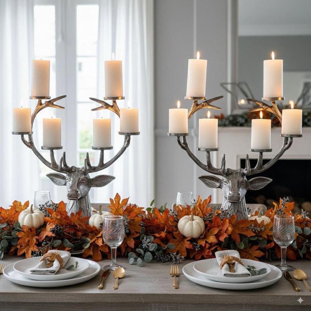 Perfect as a statement table centre piece or as a decorative ornament for a sideboard, this candle holder features a stunning strong aluminium stag which antlers holds 6 candles. Perfect to light up any room.