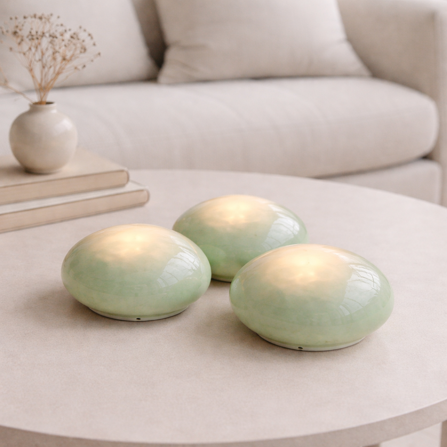 This sculptural glass light transforms illumination into a quiet, tactile ritual. Its smooth, rounded form echoes objects shaped by touch and time, inviting interaction through a gentle tap that adjusts the brightness to suit mood and moment. The warm white LEDs emit a soft, ambient glow—designed not to dominate a space, but to settle into it, creating an atmosphere of calm and intimacy.